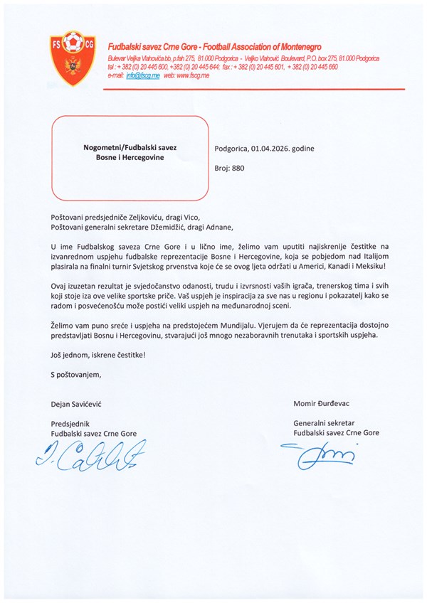 U ime Fudbalskog saveza Crne Gore i u lično ime, želimo vam uputiti najiskrenije čestitke na izvanrednom uspjehu fudbalske reprezentacije Bosne i Hercegovine, koja se pobjedom nad Italijom plasirala na finalni turnir Svjetskog prvenstva koje će se ovog ljeta održati u Americi, Kanadi i Meksiku!